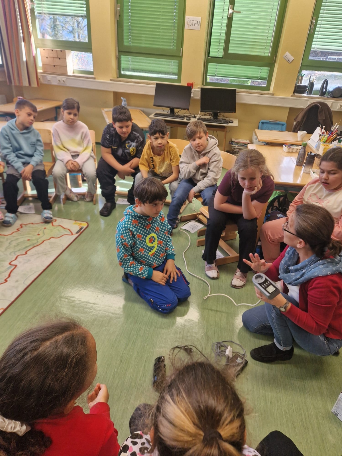 Außerdem sind die Kinder mit einem Luxmessgerät und einem Sekundenthermometer ausgestattet, um Beleuchtungsstärke Raumwärme unter die Lupe zu nehmen. Nach dem Startworkshop sind die Kinder der Klassen voller Tatendrang und freuen sich auf die Detektivarbeit mit den Messgeräten in der Schule.